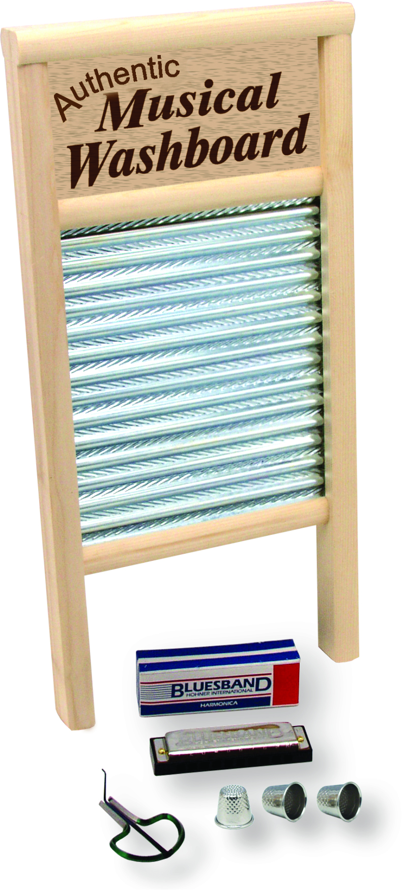Have even more fun with our “Country Music Jamboree” set. Our same high quality musical washboard also comes with an outstanding 10 hole Harmonica and a Jaw Harp. Also included are 3 metal thimbles for a brilliant sound. Perfect for that “Zydeco” sound.