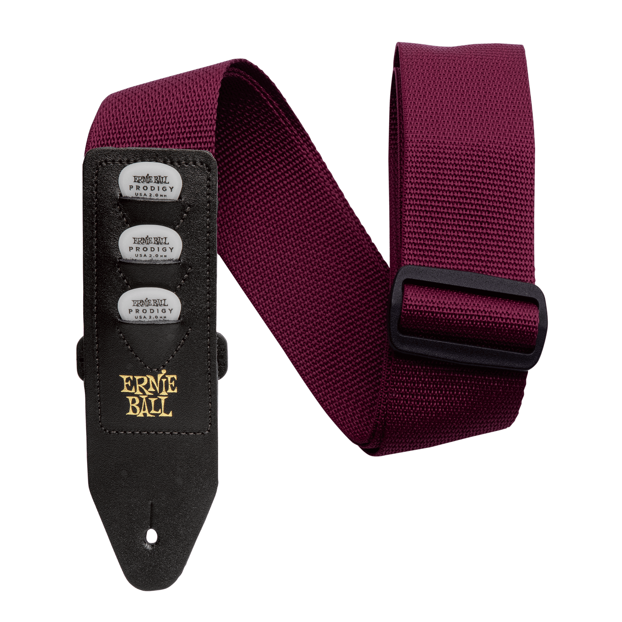 The Pickholder polypro guitar strap is designed with an extended leather end to conveniently house up to three guitar picks on the lower front end of the strap. The leather ends are embroidered on comfortable 2� wide polypropylene webbing, providing added durability and strength. Strap length is fully adjustable for short or extra long applications. Overall strap measures 41 inches to 72 inches long.